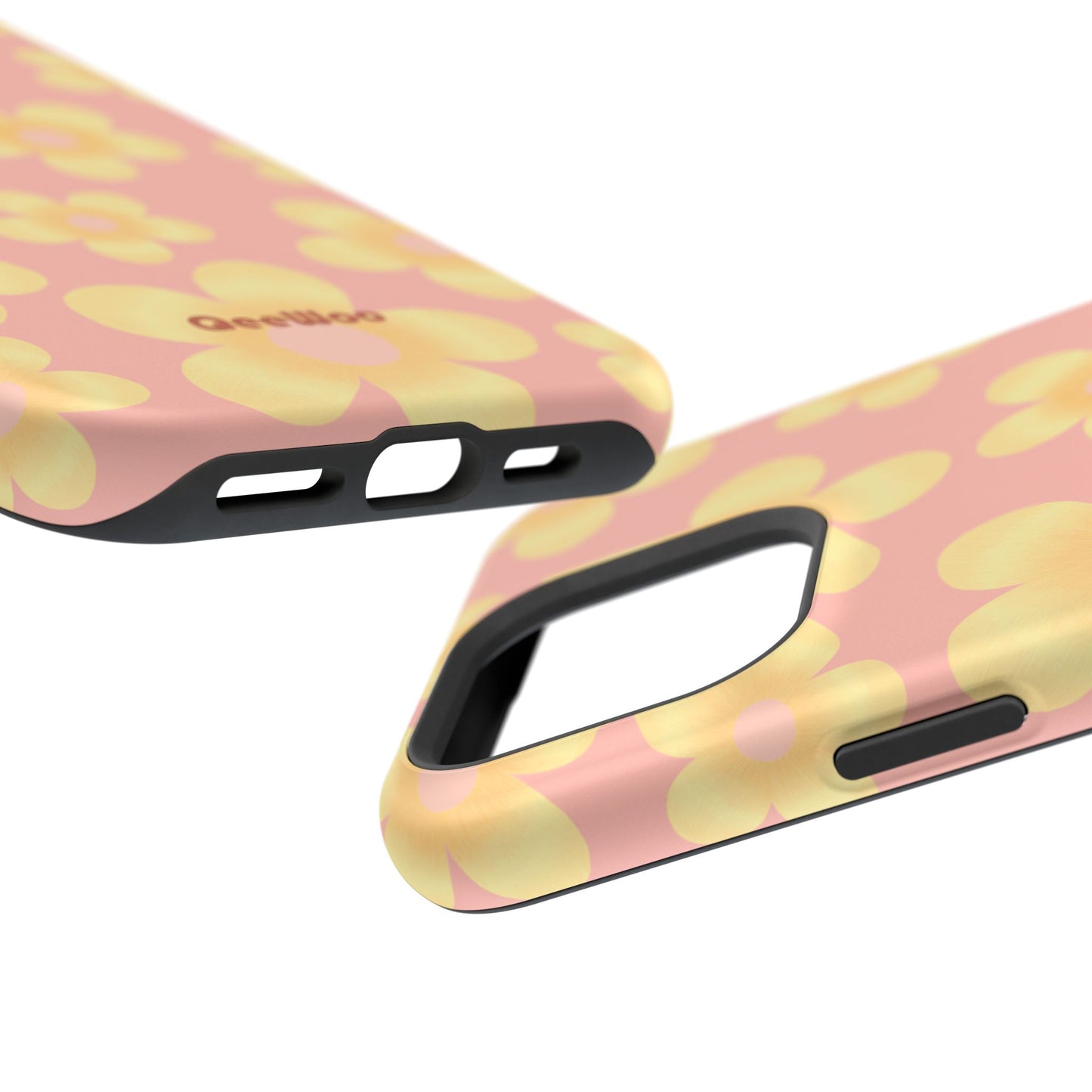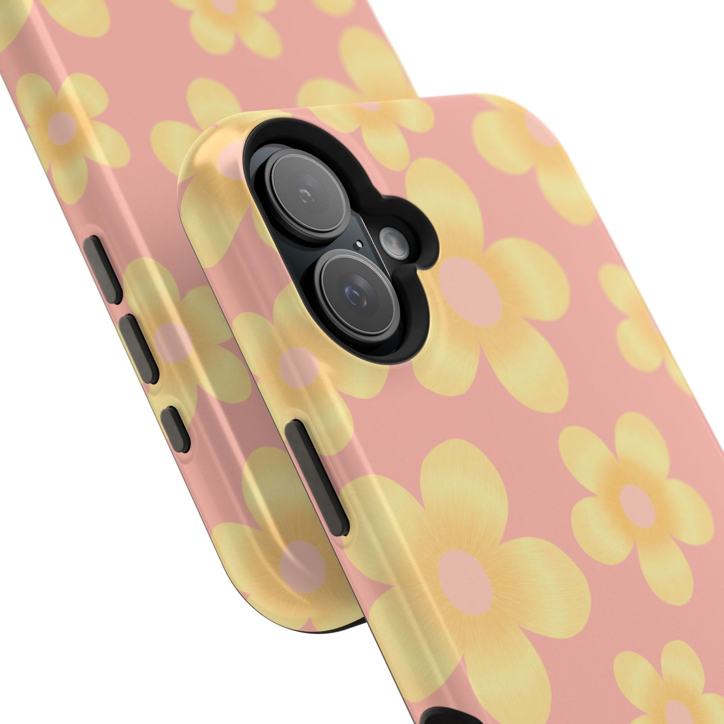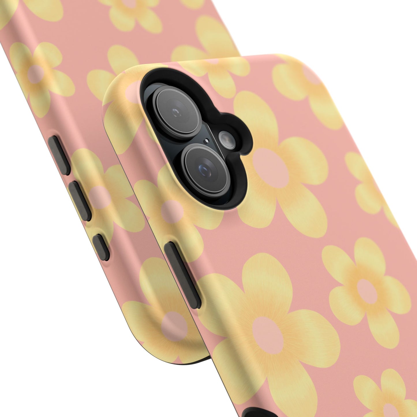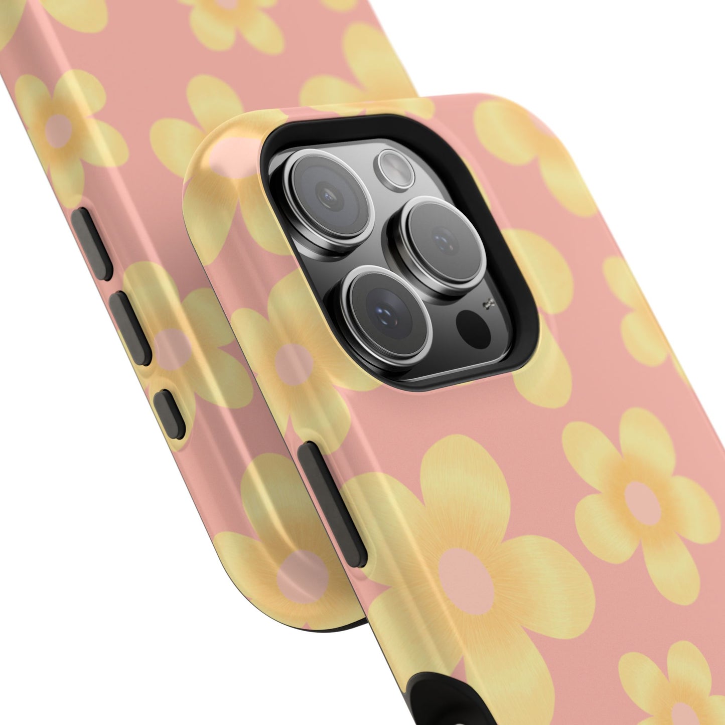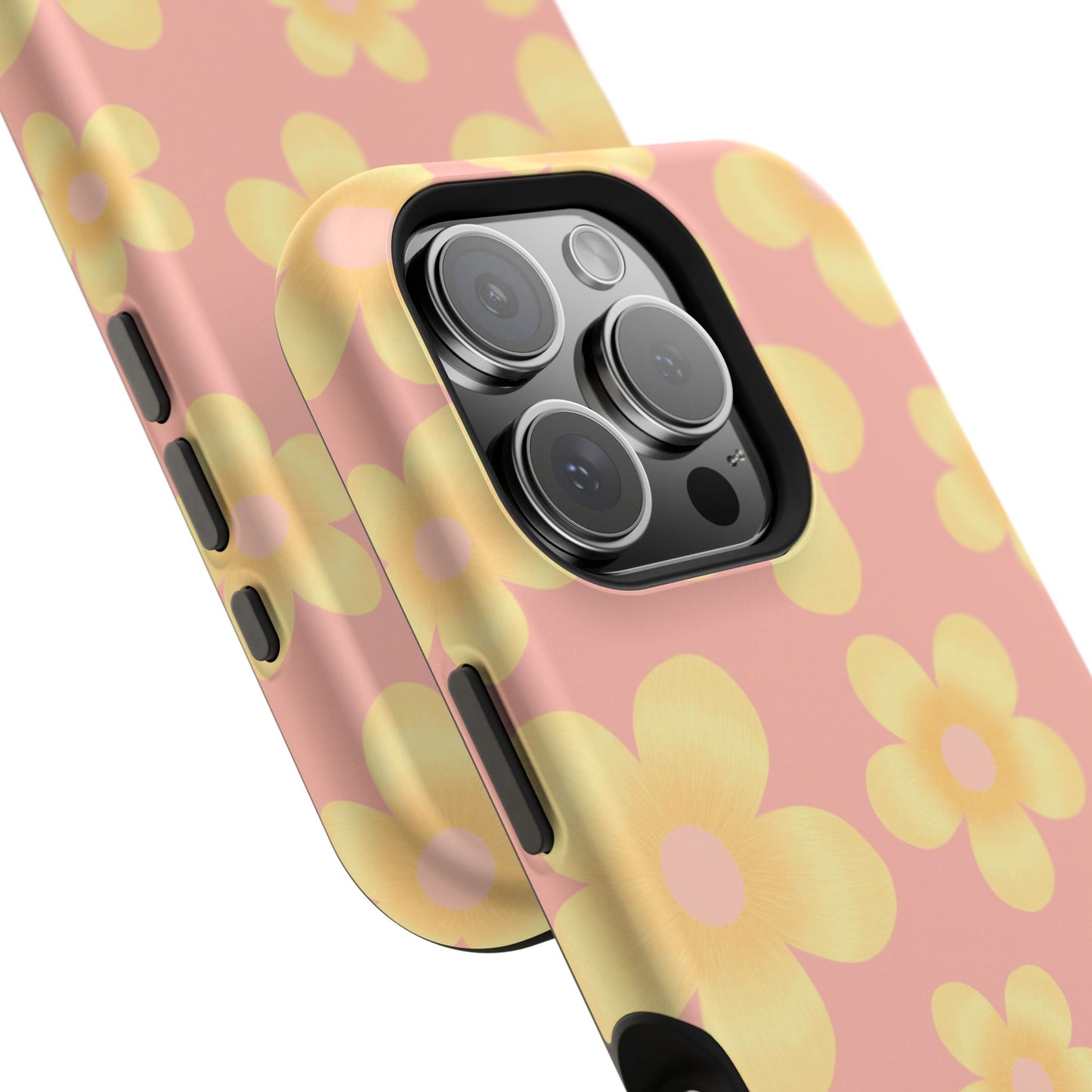 A lightweight protective phone case with a soft retro bloom pattern that brings a warm, nostalgic glow to everyday carry. The glossy or matte exterior shows off vibrant, high-resolution petals in buttery yellow against a gentle peach background. Inside, a cushioned TPU liner and rigid polycarbonate shell work together to absorb shocks and resist scratches. Built-in magnets add MagSafe® compatibility so the case stays aligned with chargers and accessories. It slips on easily and keeps your device looking cheerful while handling daily knocks and drops.