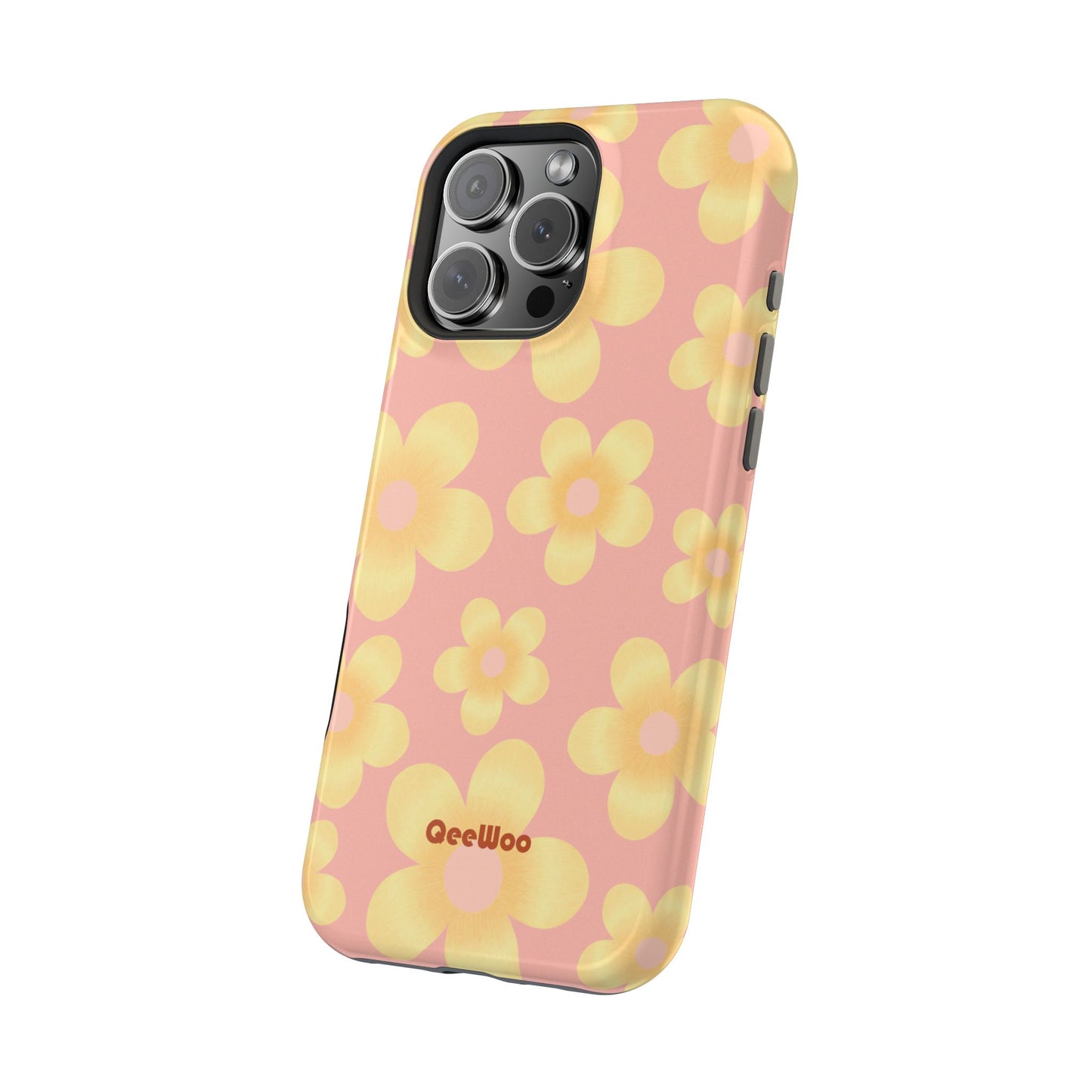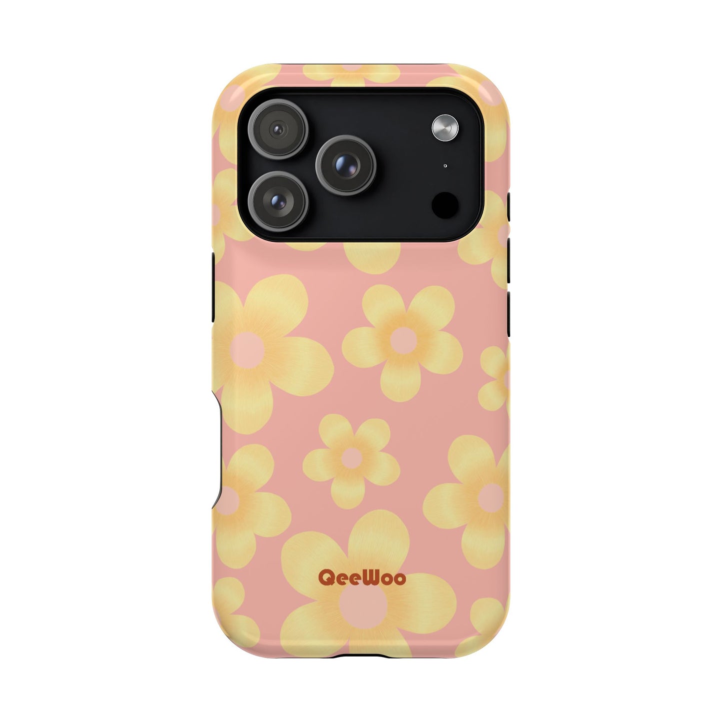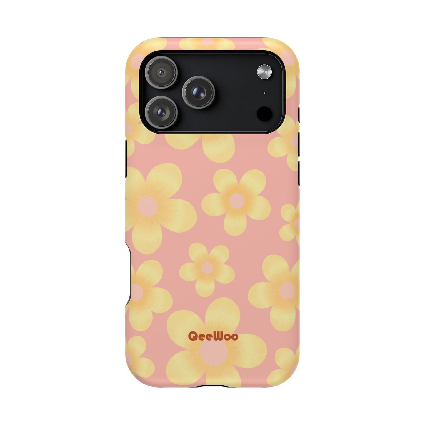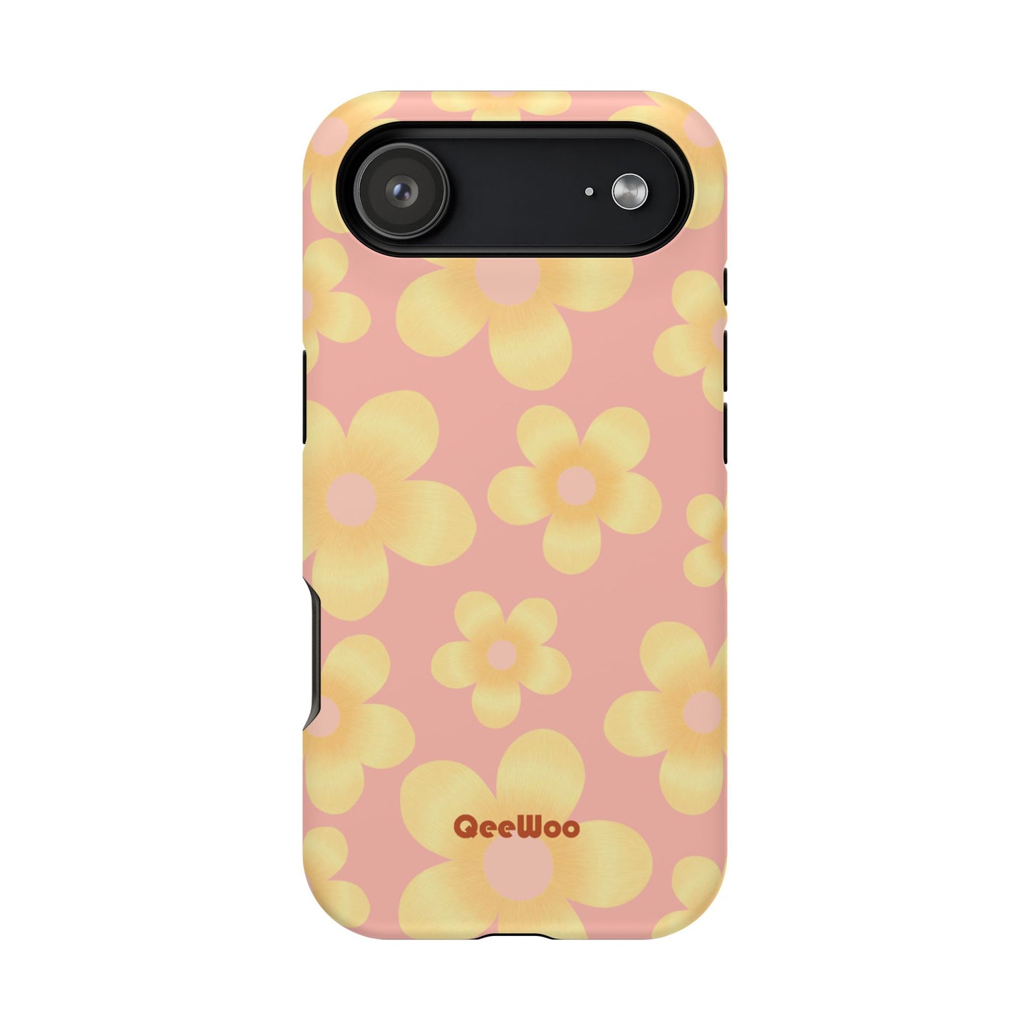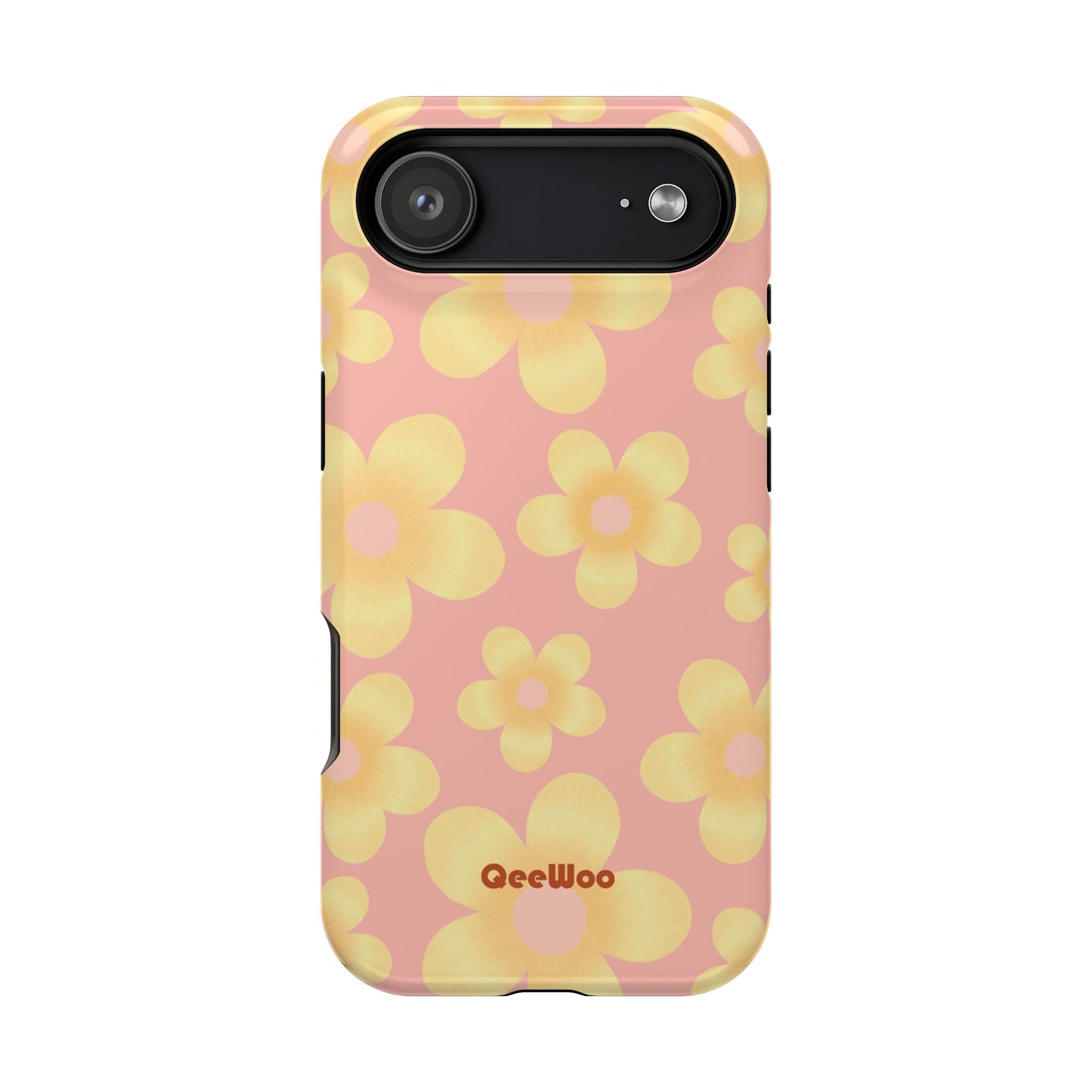 A lightweight protective phone case with a soft retro bloom pattern that brings a warm, nostalgic glow to everyday carry. The glossy or matte exterior shows off vibrant, high-resolution petals in buttery yellow against a gentle peach background. Inside, a cushioned TPU liner and rigid polycarbonate shell work together to absorb shocks and resist scratches. Built-in magnets add MagSafe® compatibility so the case stays aligned with chargers and accessories. It slips on easily and keeps your device looking cheerful while handling daily knocks and drops.