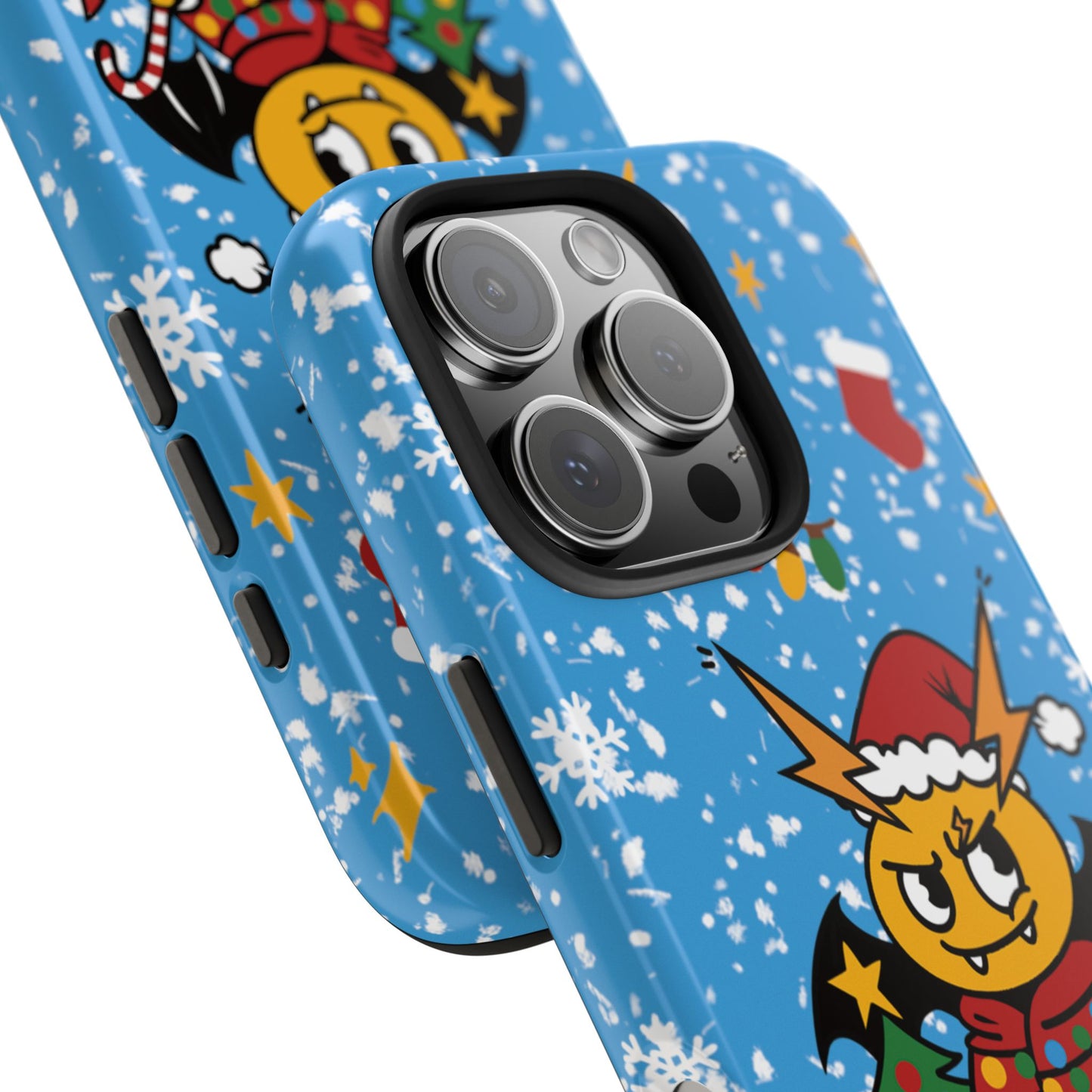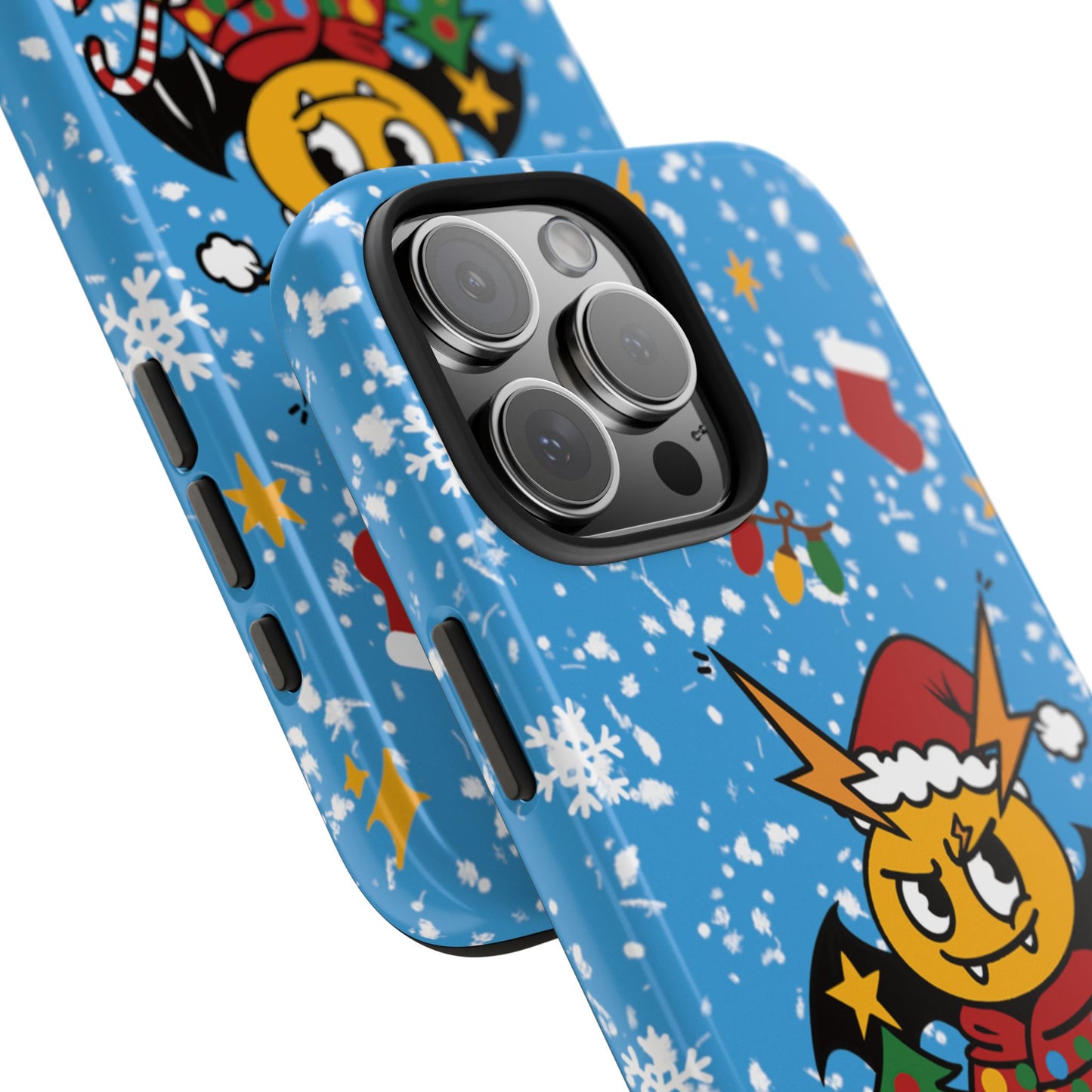 A spirited holiday phone case that brings playful cheer to everyday carry. Lightweight yet tough, this two-piece case wraps your phone in a glossy, snow-speckled scene featuring a mischievous holiday mascot in a Santa hat, candy cane, and tiny Christmas tree. The raised bezel keeps the screen off surfaces, while the shock-absorbing rubber liner cushions against drops. Bright, UV-protected printing keeps the colors vivid through winter markets, snowy commutes, and festive gatherings. It slips into a pocket or tote easily and keeps wireless charging convenient so you can stay connected while celebrating the season.