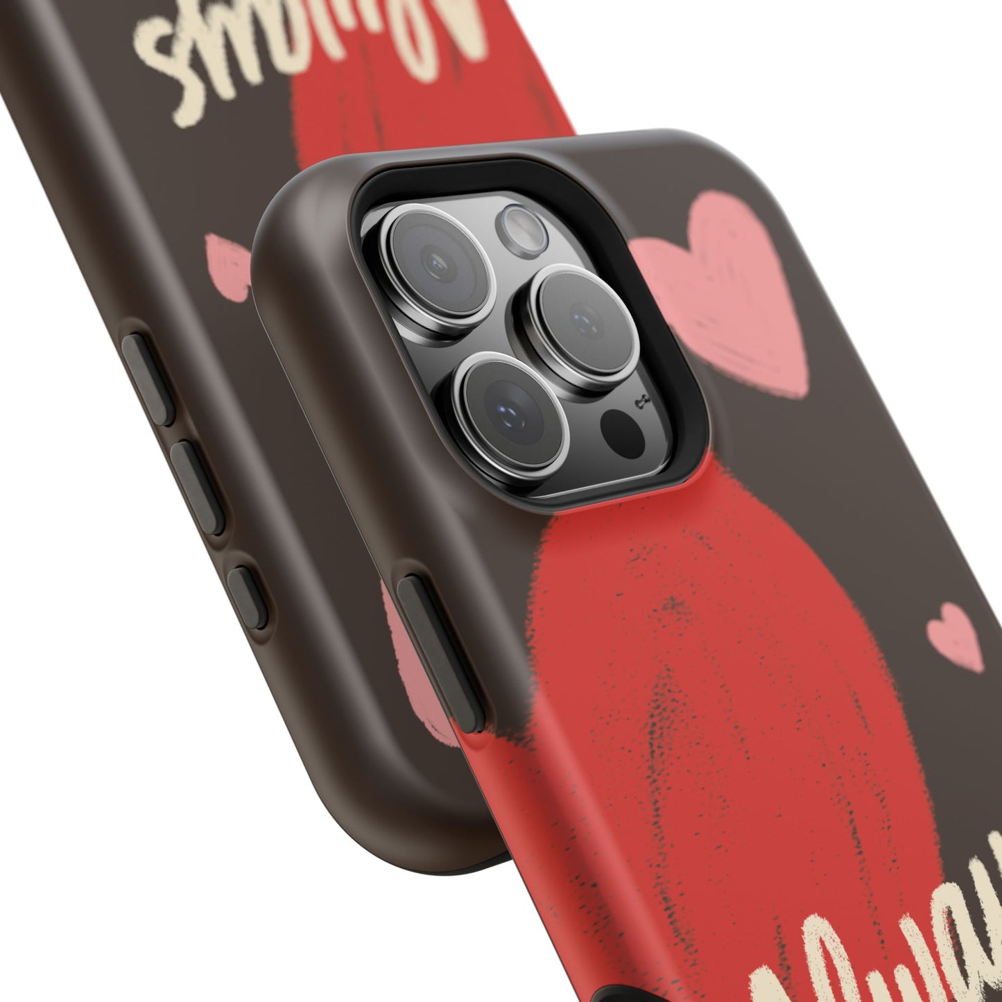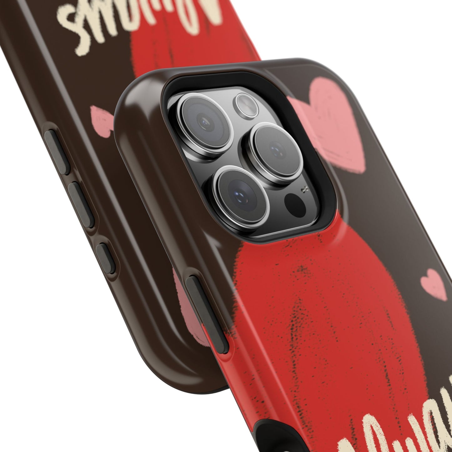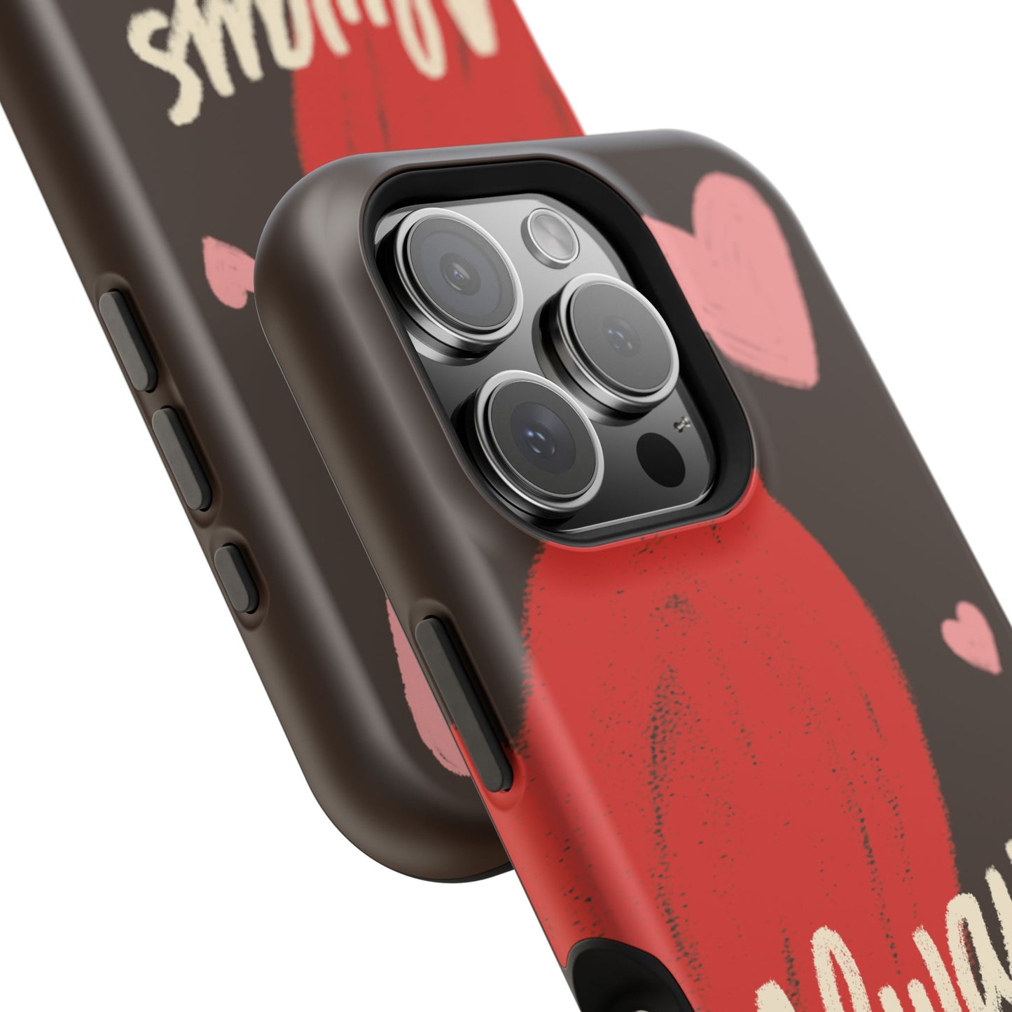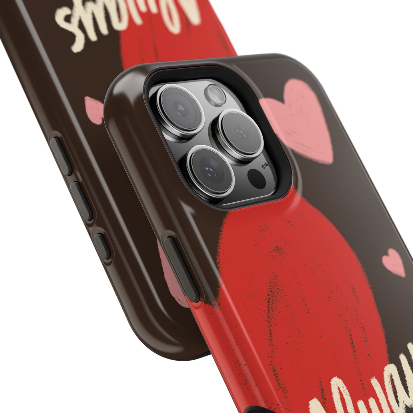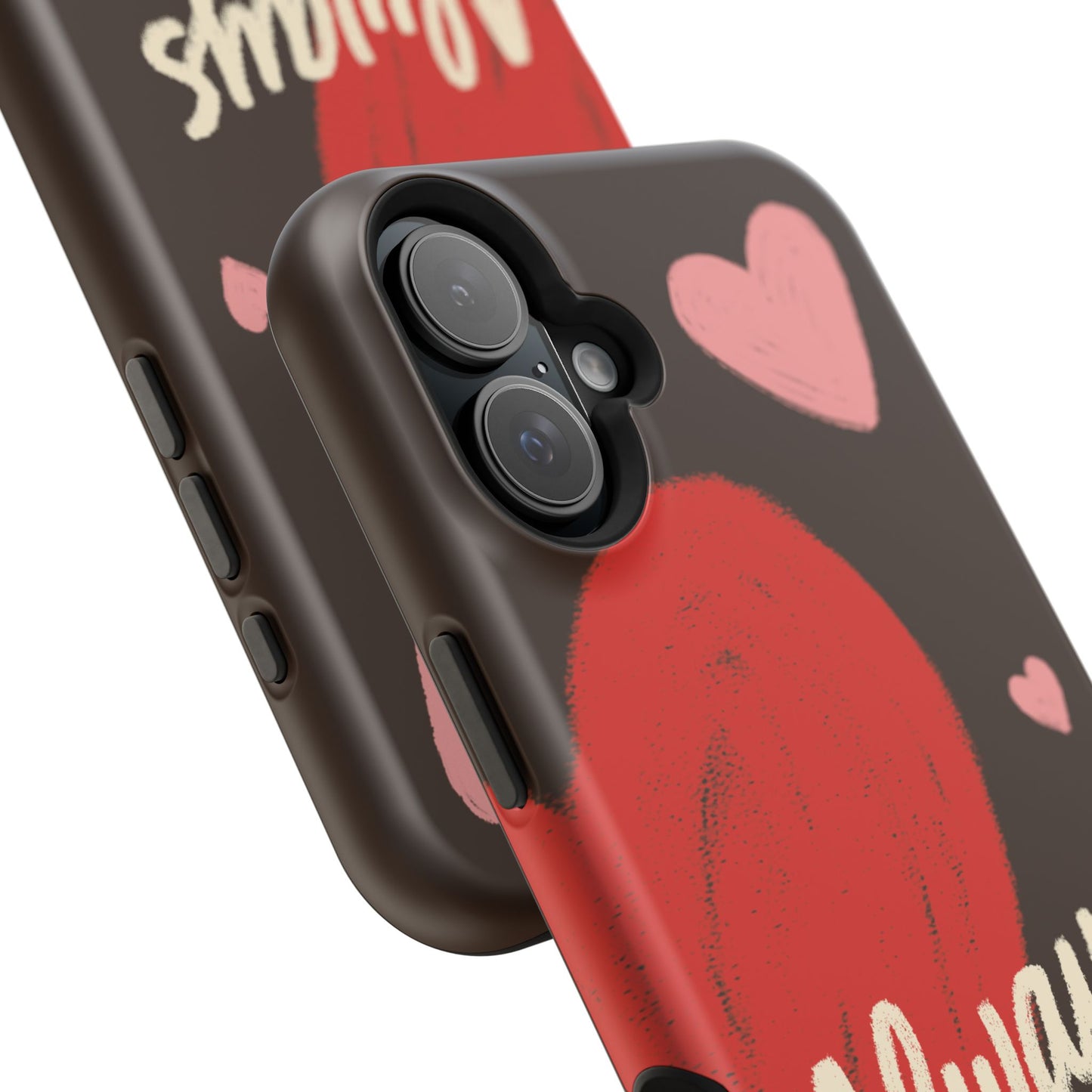 'Passionate Chocolate' a single right. A slim, impact-resistant phone case painted with warm, hand-drawn hearts and the word “Love” across a deep brown background. The glossy (or matte) full-wrap print brings bright reds and soft pinks to life, while a cushioned black TPU liner and rigid polycarbonate shell protect against everyday bumps and scratches. Built-in magnets support MagSafe® accessories for convenient charging and mounting. Lightweight yet durable, it slips easily into pockets and stands up to daily use while keeping a romantic, artsy look.