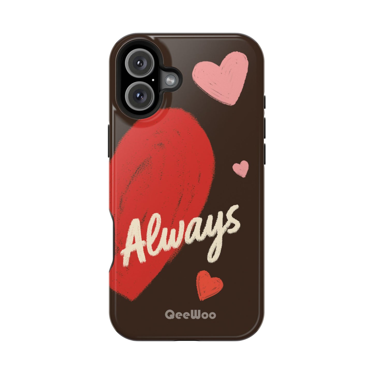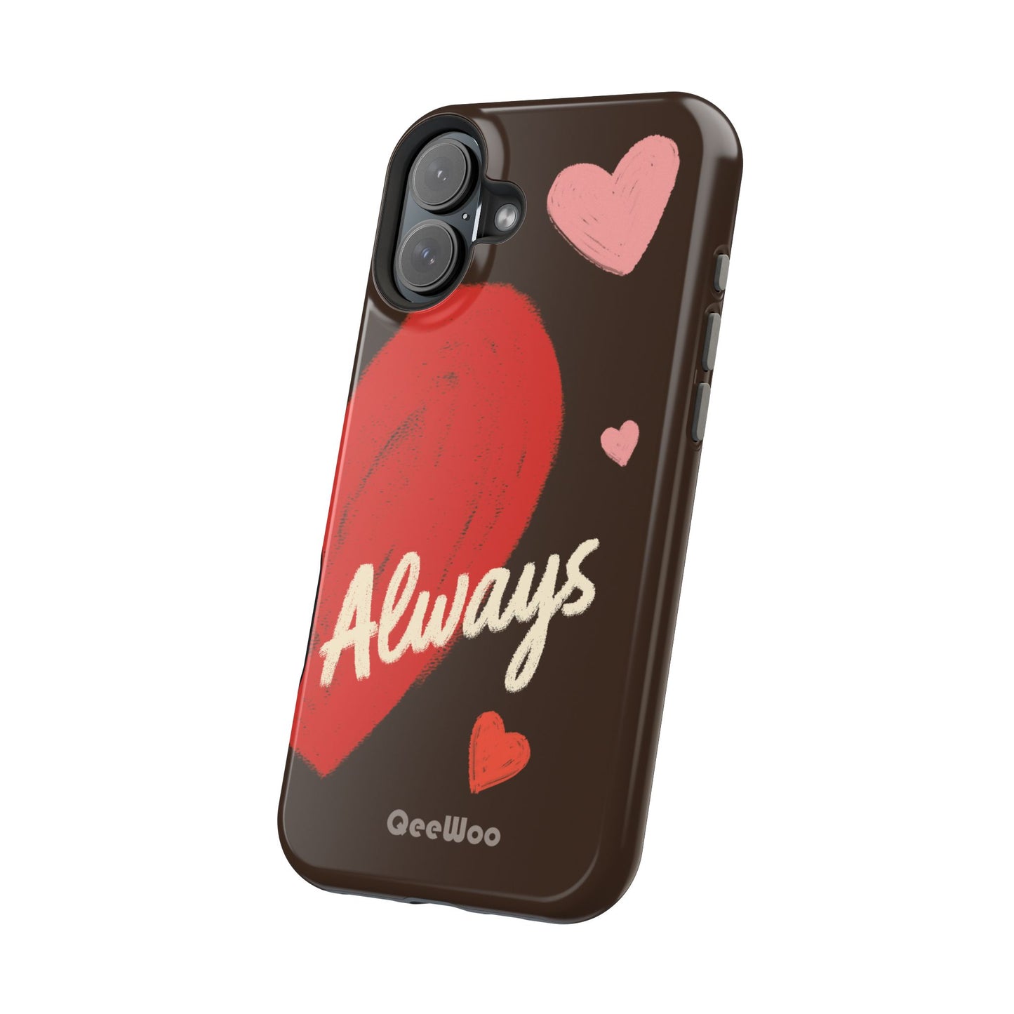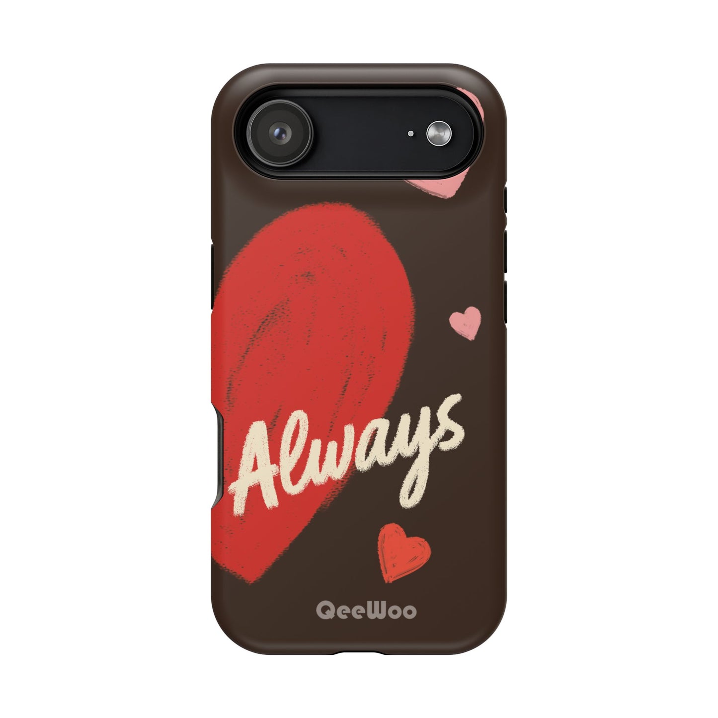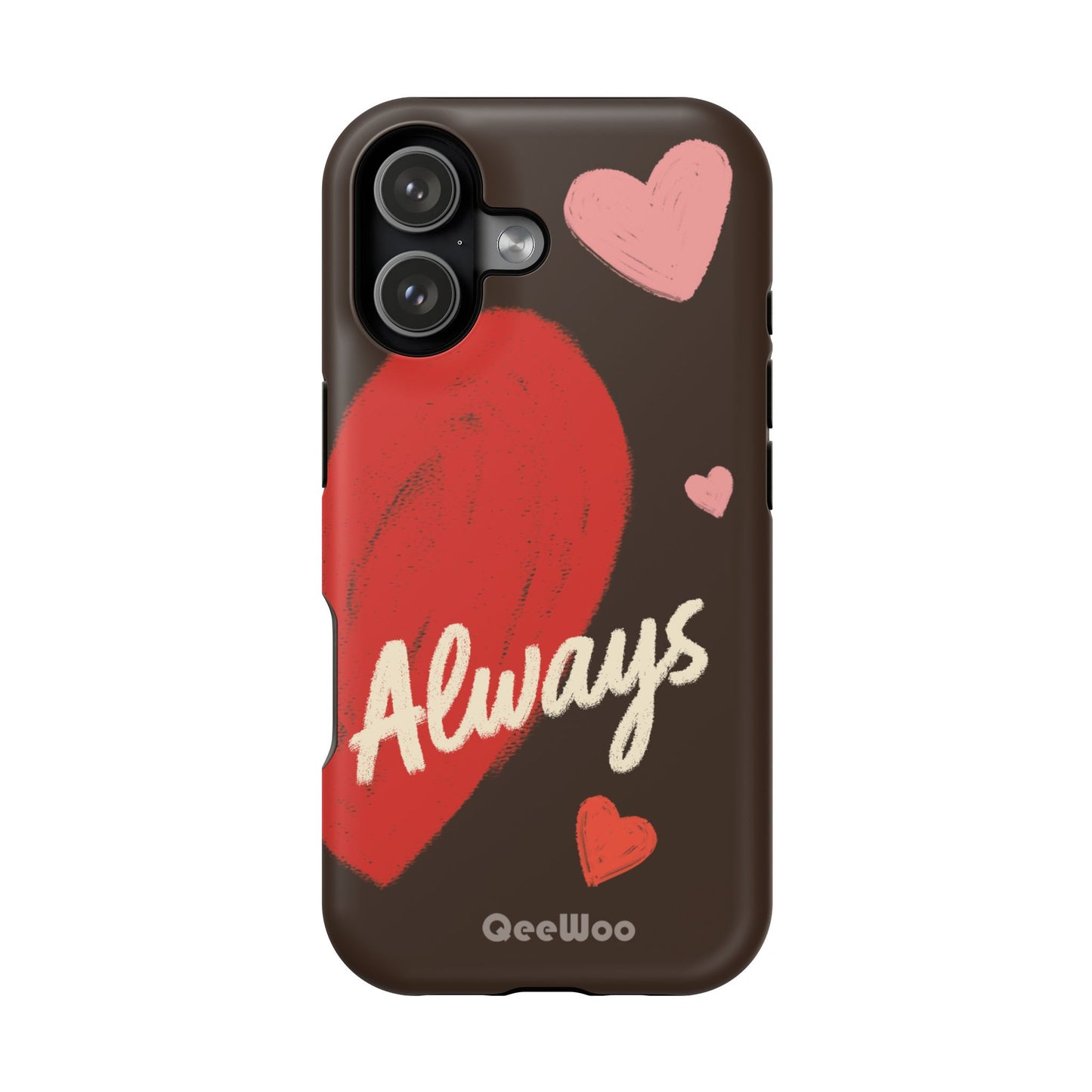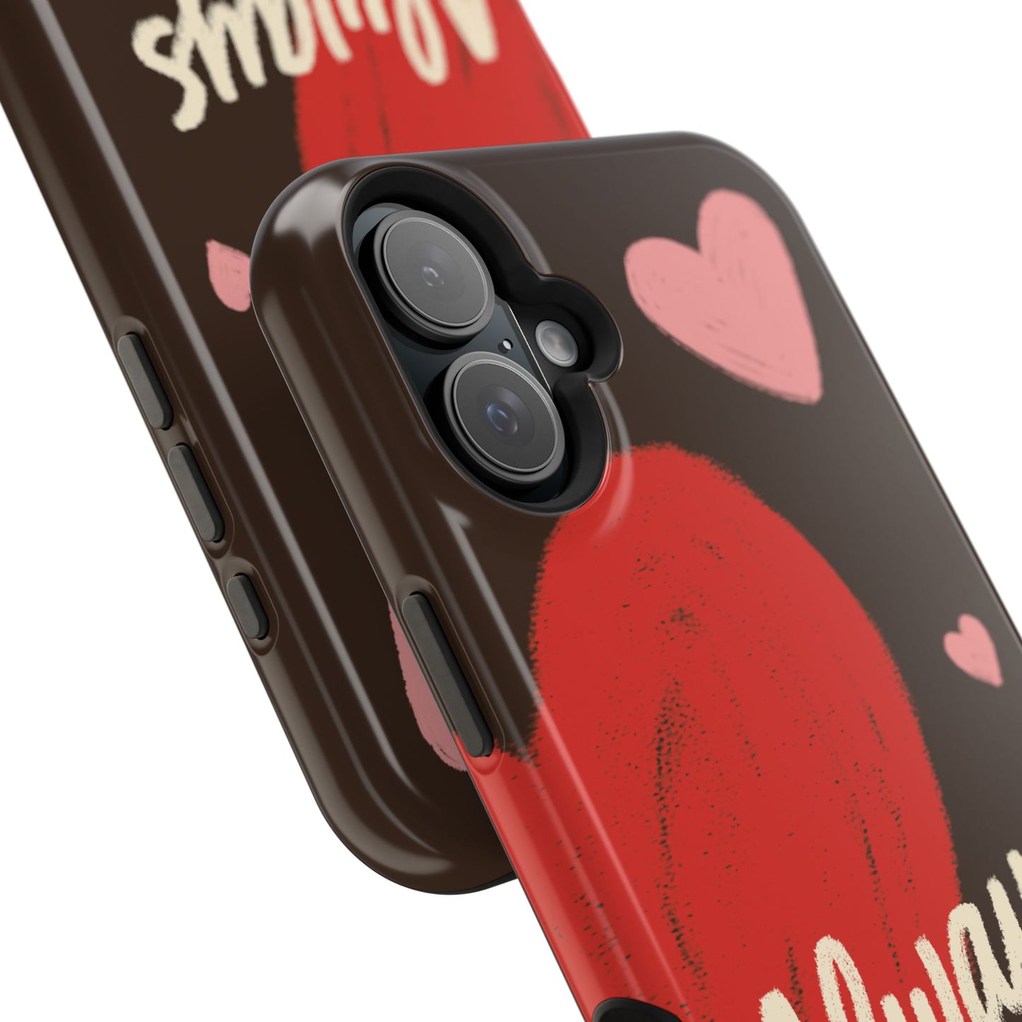 'Passionate Chocolate' a single right. A slim, impact-resistant phone case painted with warm, hand-drawn hearts and the word “Love” across a deep brown background. The glossy (or matte) full-wrap print brings bright reds and soft pinks to life, while a cushioned black TPU liner and rigid polycarbonate shell protect against everyday bumps and scratches. Built-in magnets support MagSafe® accessories for convenient charging and mounting. Lightweight yet durable, it slips easily into pockets and stands up to daily use while keeping a romantic, artsy look.