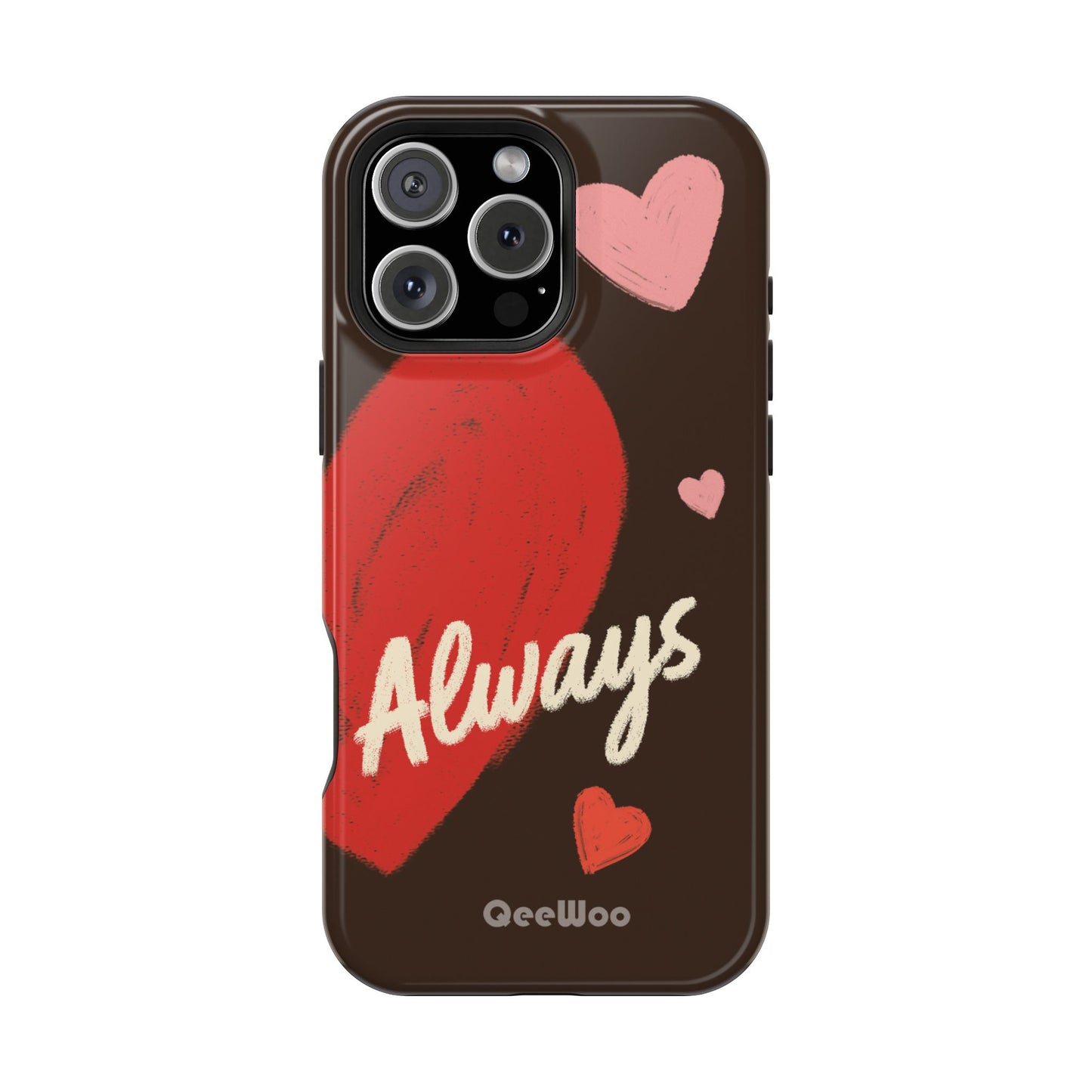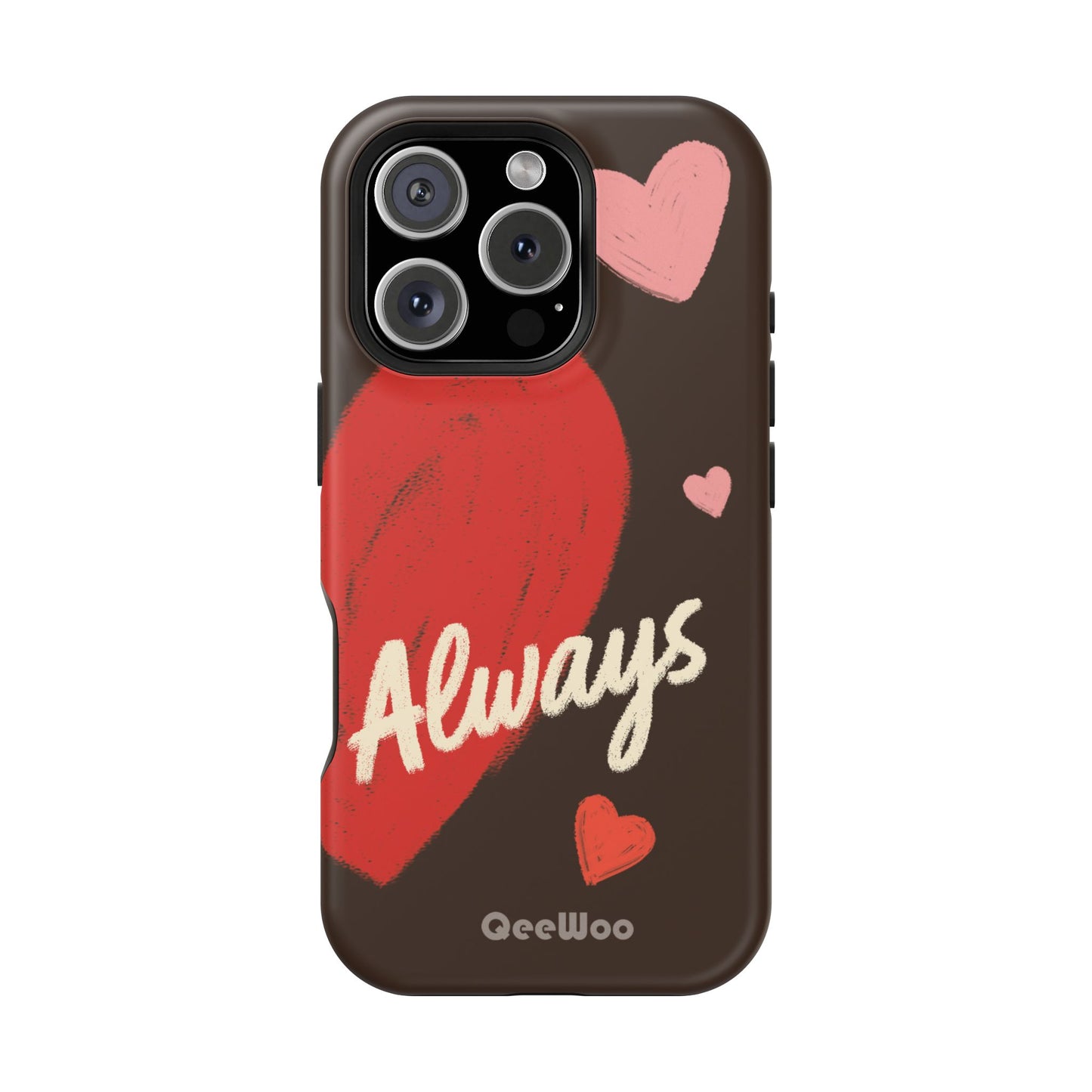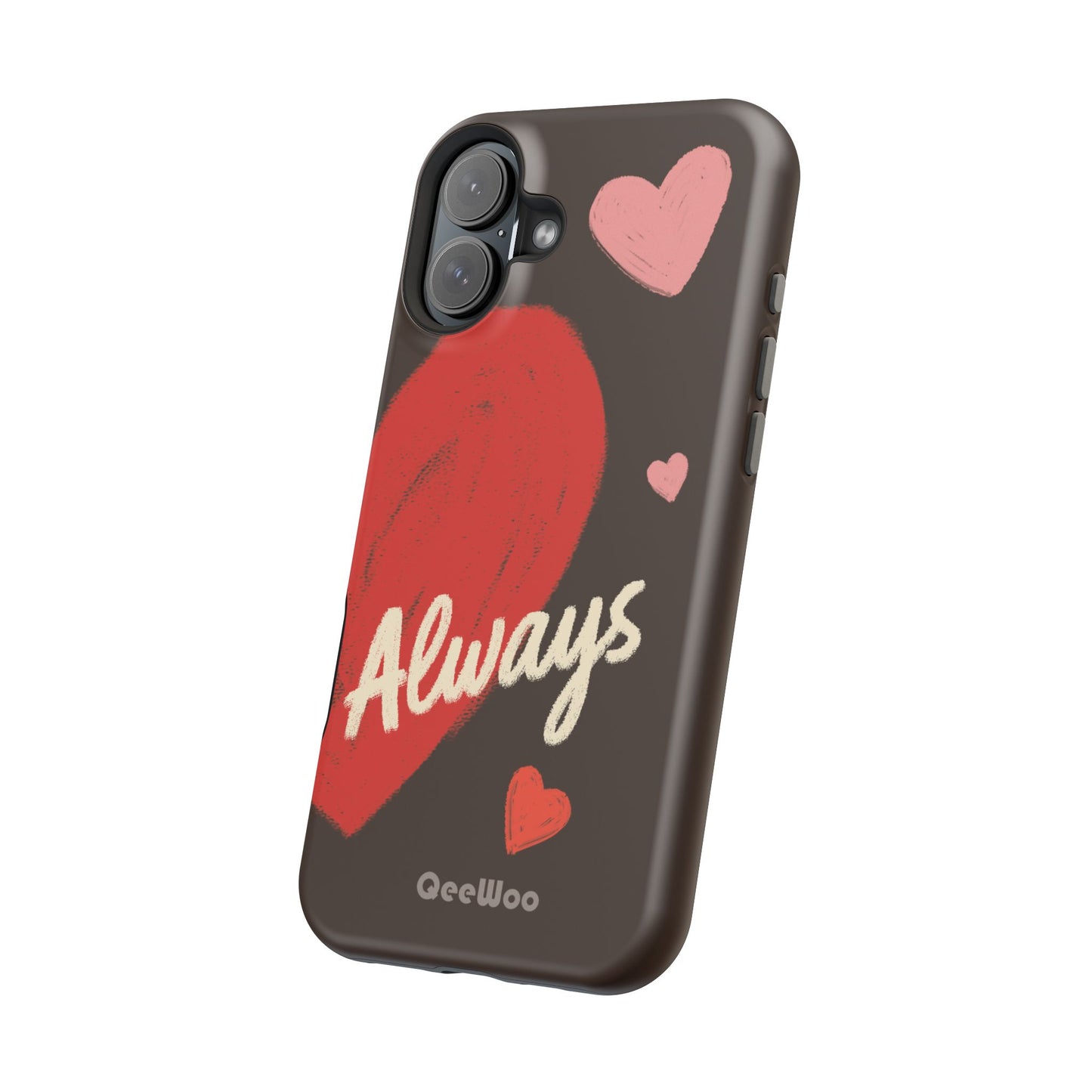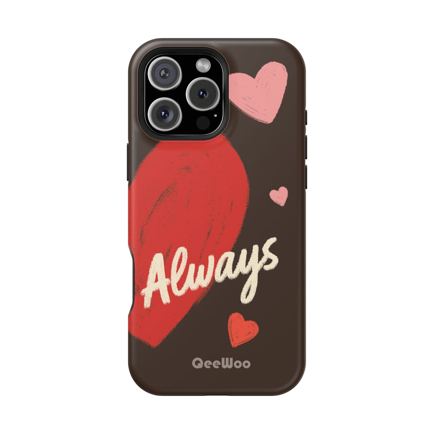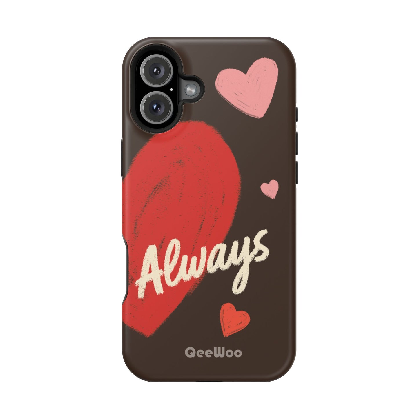 'Passionate Chocolate' a single right. A slim, impact-resistant phone case painted with warm, hand-drawn hearts and the word “Love” across a deep brown background. The glossy (or matte) full-wrap print brings bright reds and soft pinks to life, while a cushioned black TPU liner and rigid polycarbonate shell protect against everyday bumps and scratches. Built-in magnets support MagSafe® accessories for convenient charging and mounting. Lightweight yet durable, it slips easily into pockets and stands up to daily use while keeping a romantic, artsy look.