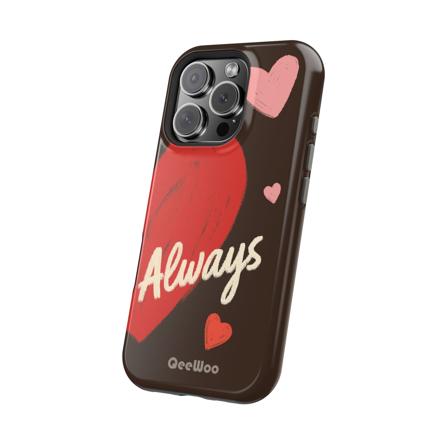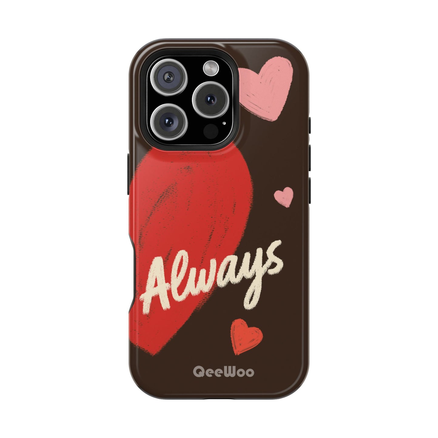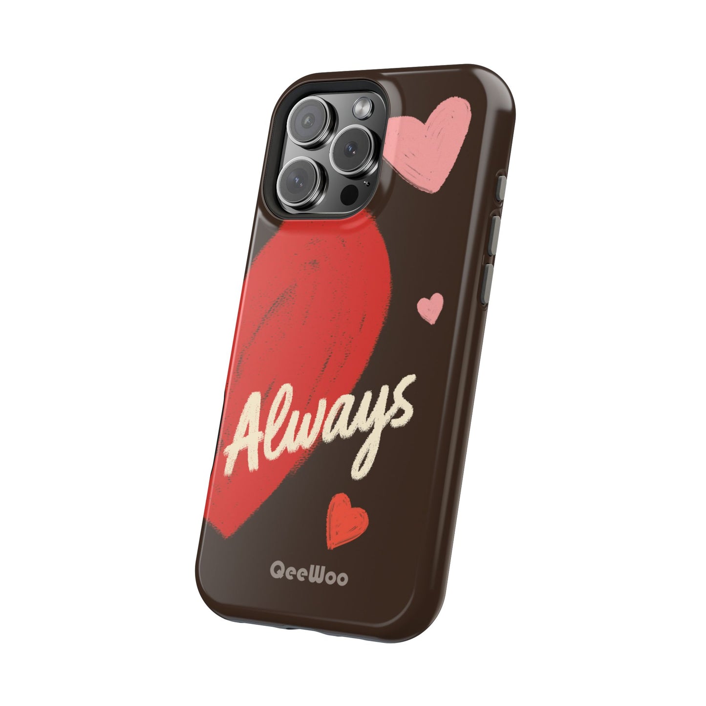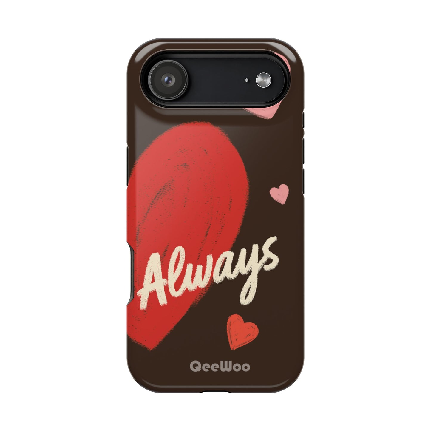 'Passionate Chocolate' a single right. A slim, impact-resistant phone case painted with warm, hand-drawn hearts and the word “Love” across a deep brown background. The glossy (or matte) full-wrap print brings bright reds and soft pinks to life, while a cushioned black TPU liner and rigid polycarbonate shell protect against everyday bumps and scratches. Built-in magnets support MagSafe® accessories for convenient charging and mounting. Lightweight yet durable, it slips easily into pockets and stands up to daily use while keeping a romantic, artsy look.