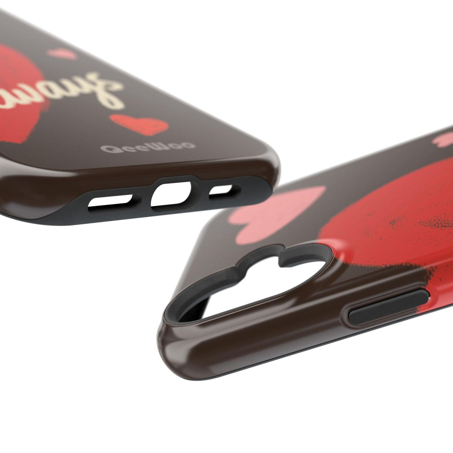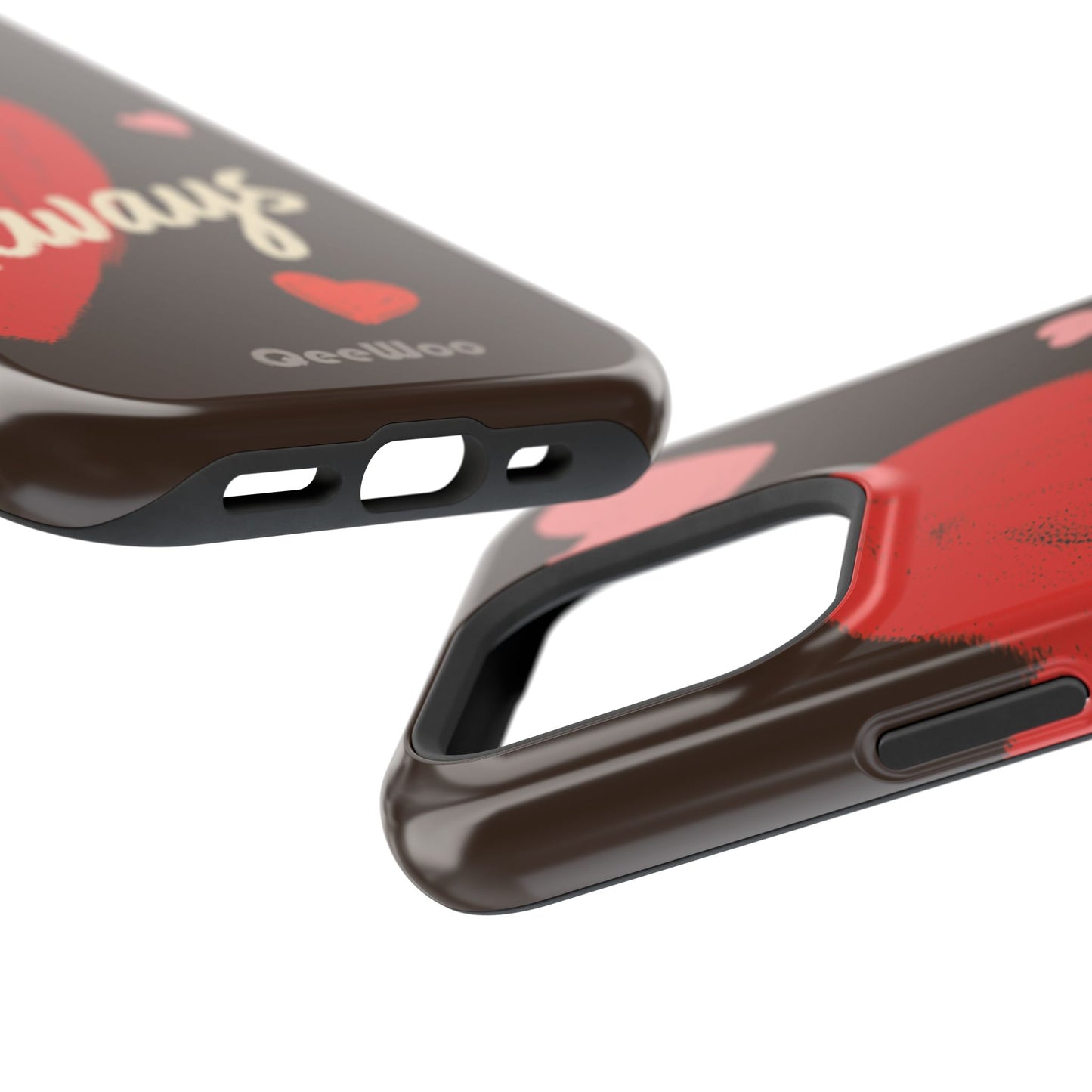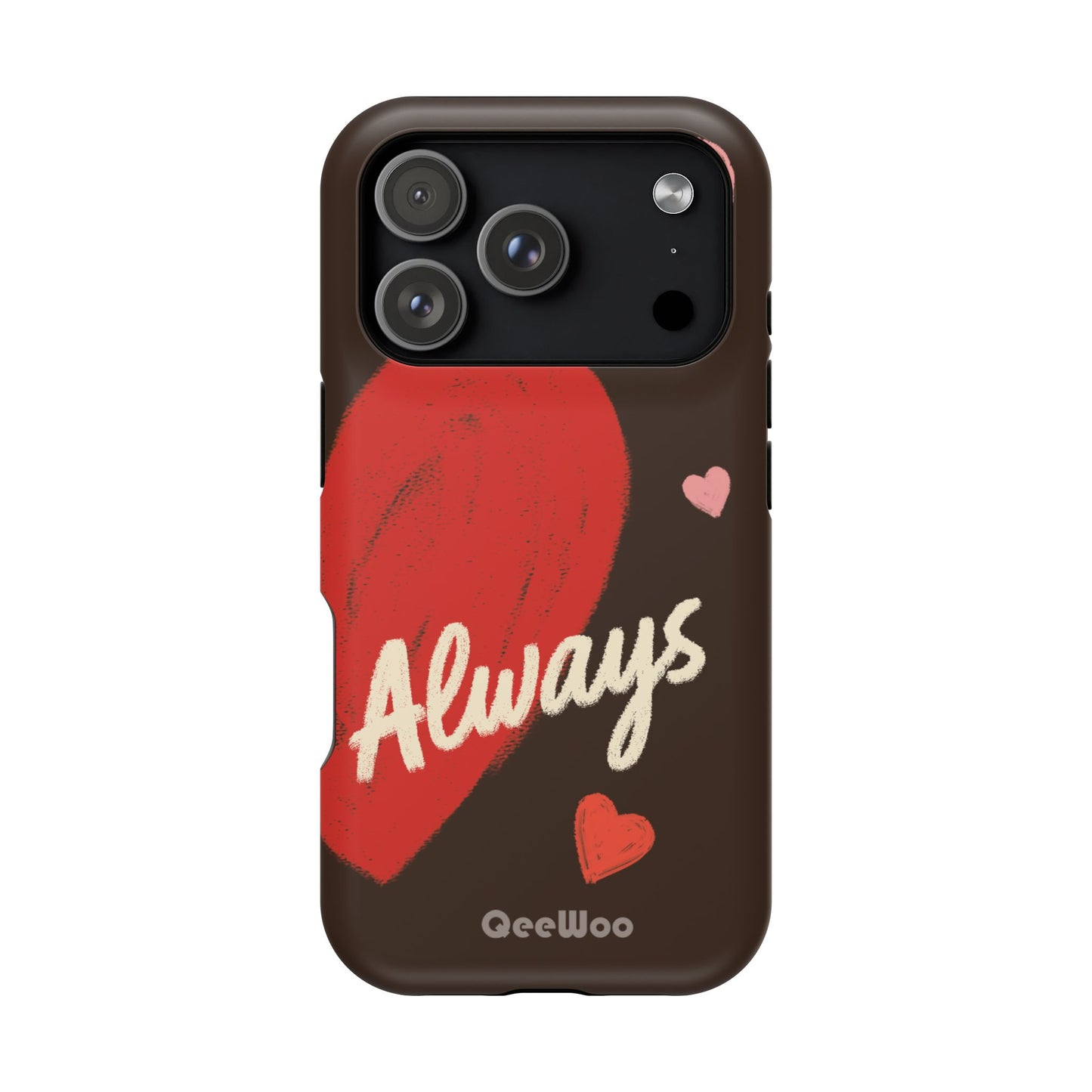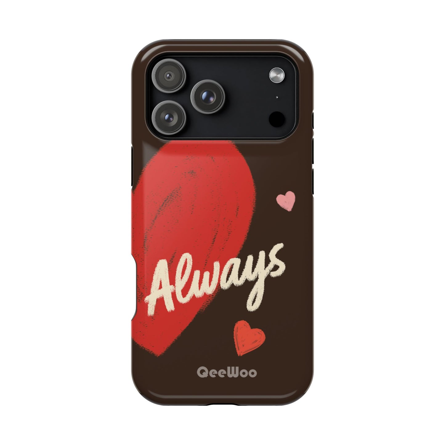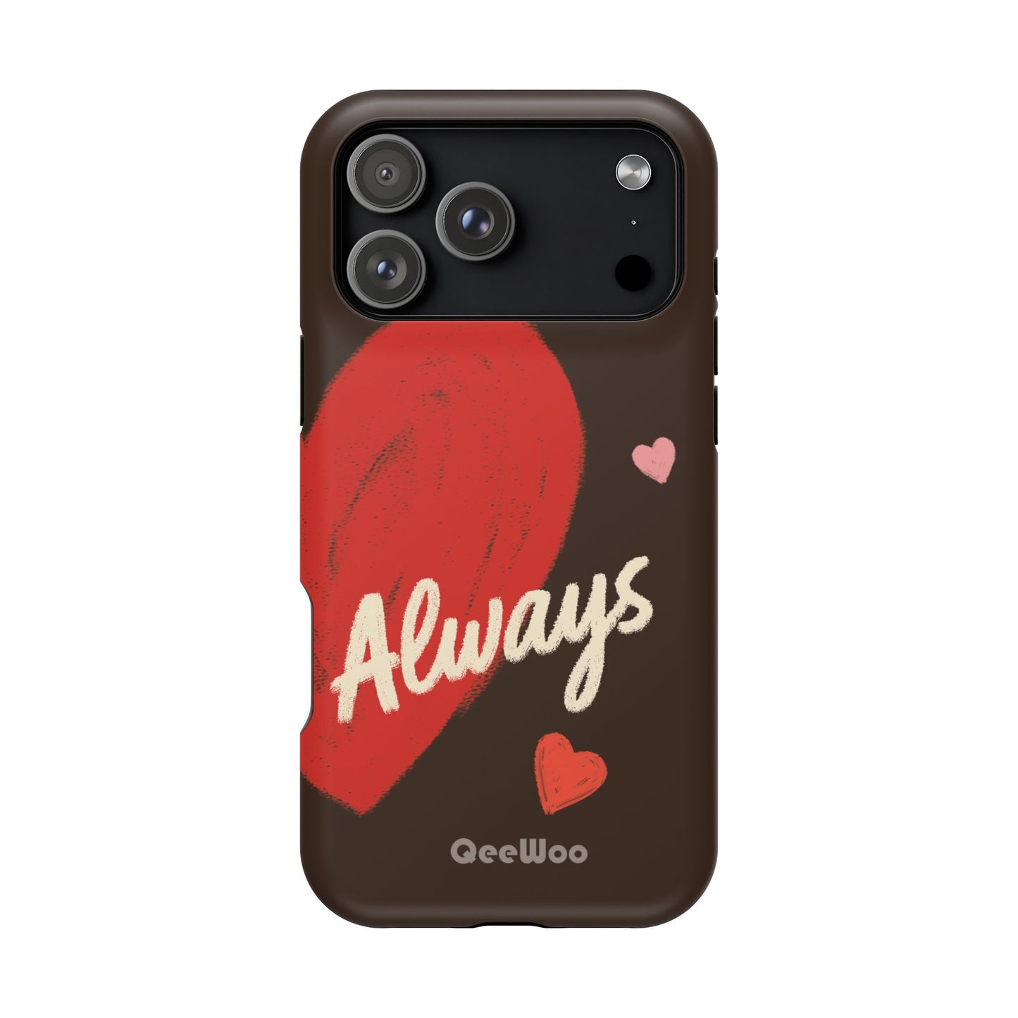 'Passionate Chocolate' a single right. A slim, impact-resistant phone case painted with warm, hand-drawn hearts and the word “Love” across a deep brown background. The glossy (or matte) full-wrap print brings bright reds and soft pinks to life, while a cushioned black TPU liner and rigid polycarbonate shell protect against everyday bumps and scratches. Built-in magnets support MagSafe® accessories for convenient charging and mounting. Lightweight yet durable, it slips easily into pockets and stands up to daily use while keeping a romantic, artsy look.