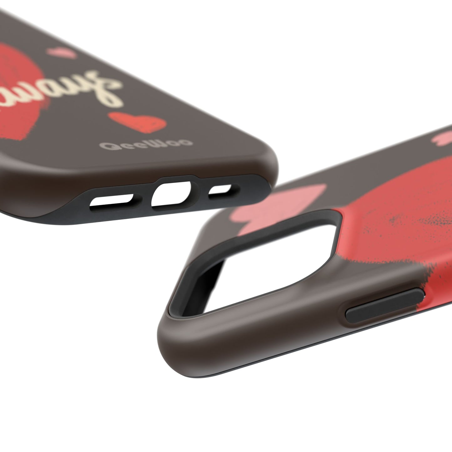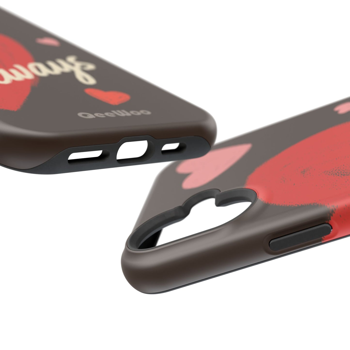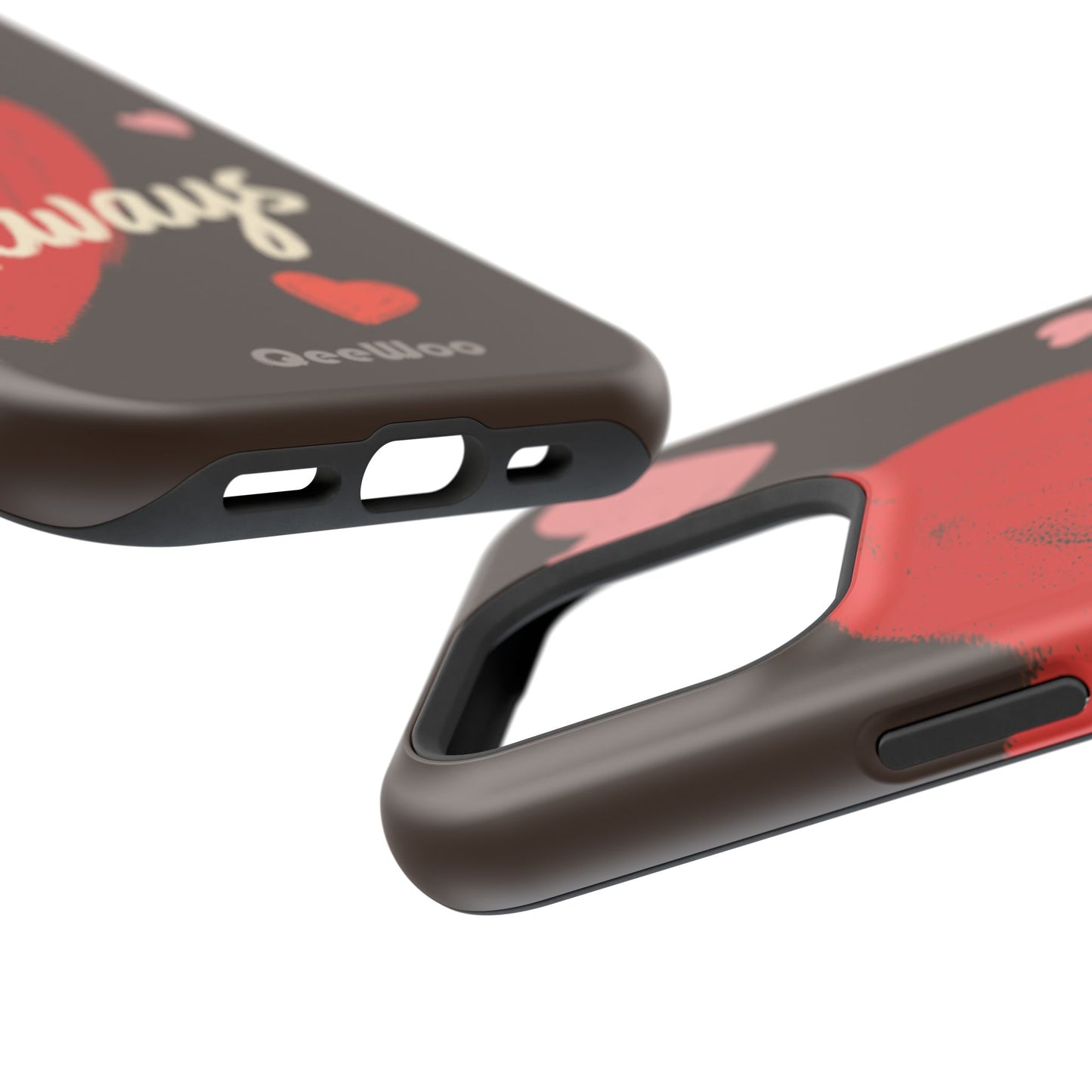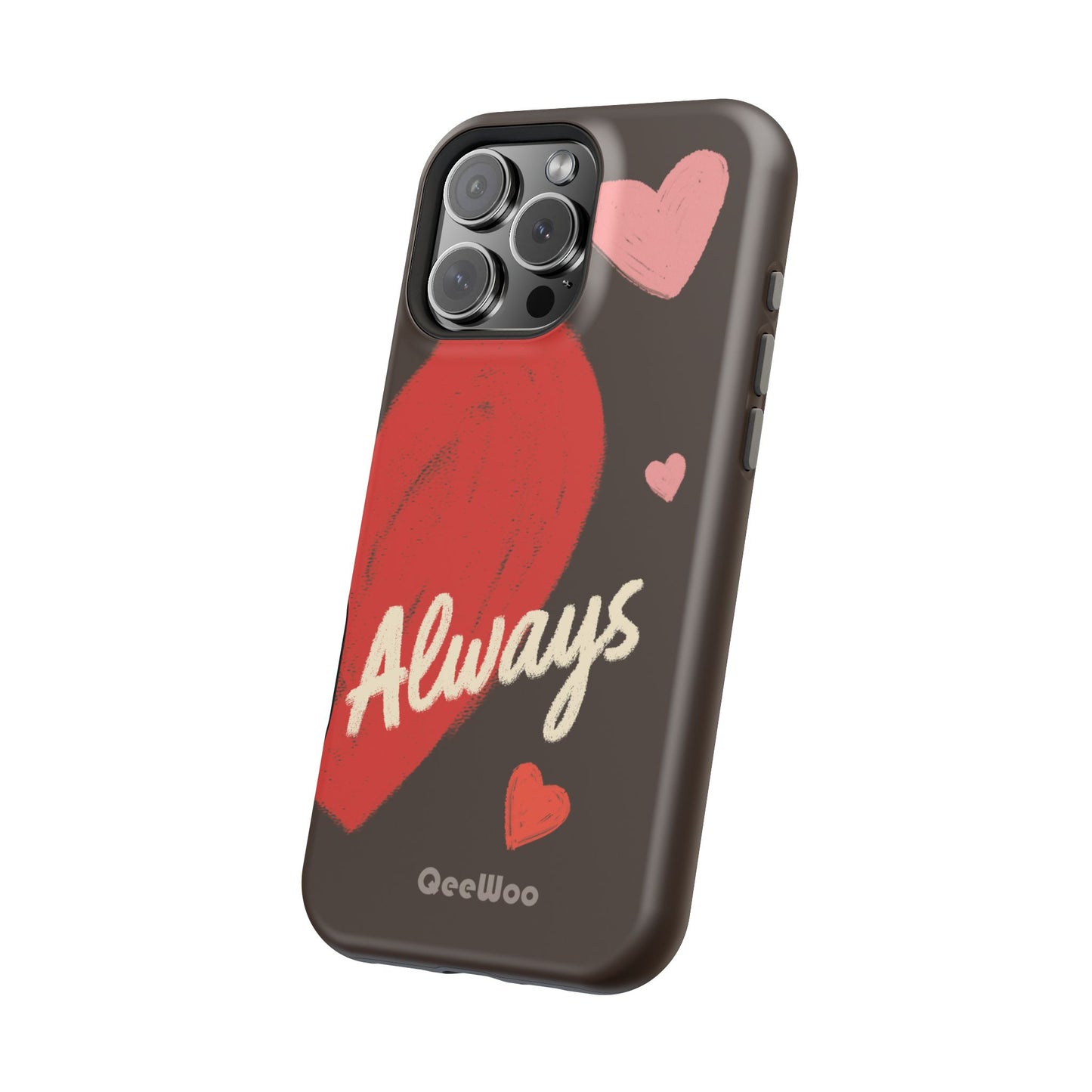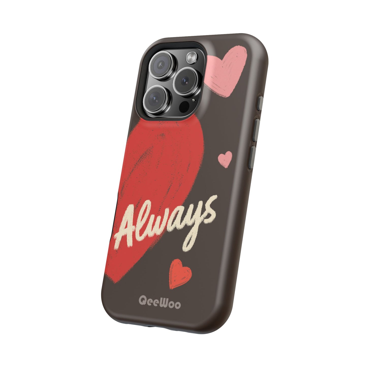 'Passionate Chocolate' a single right. A slim, impact-resistant phone case painted with warm, hand-drawn hearts and the word “Love” across a deep brown background. The glossy (or matte) full-wrap print brings bright reds and soft pinks to life, while a cushioned black TPU liner and rigid polycarbonate shell protect against everyday bumps and scratches. Built-in magnets support MagSafe® accessories for convenient charging and mounting. Lightweight yet durable, it slips easily into pockets and stands up to daily use while keeping a romantic, artsy look.
