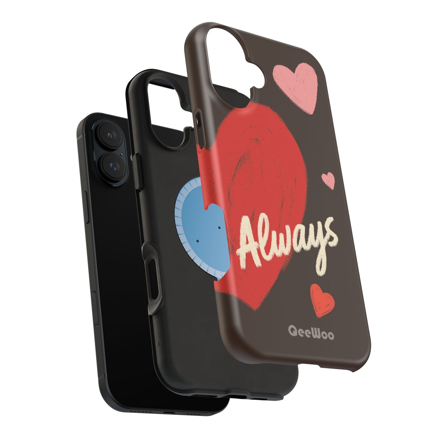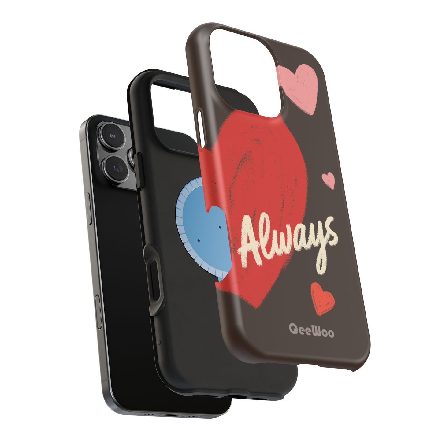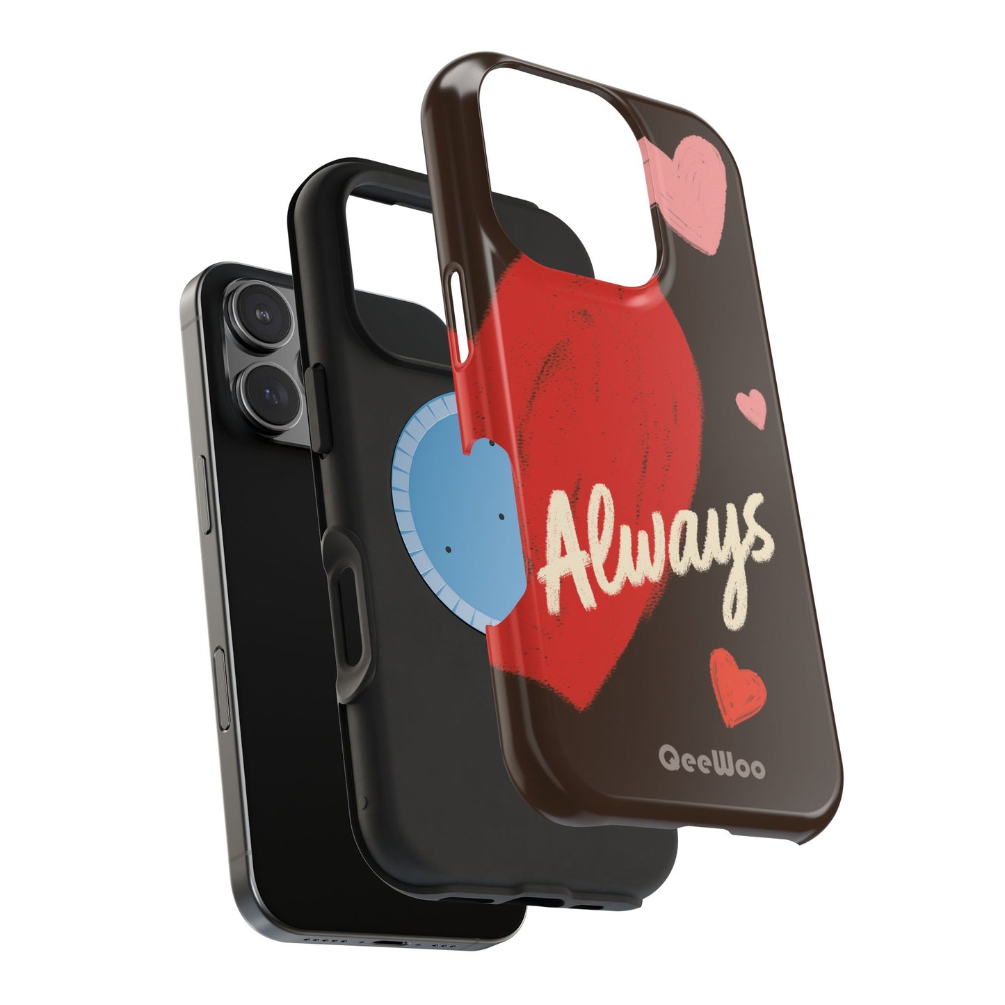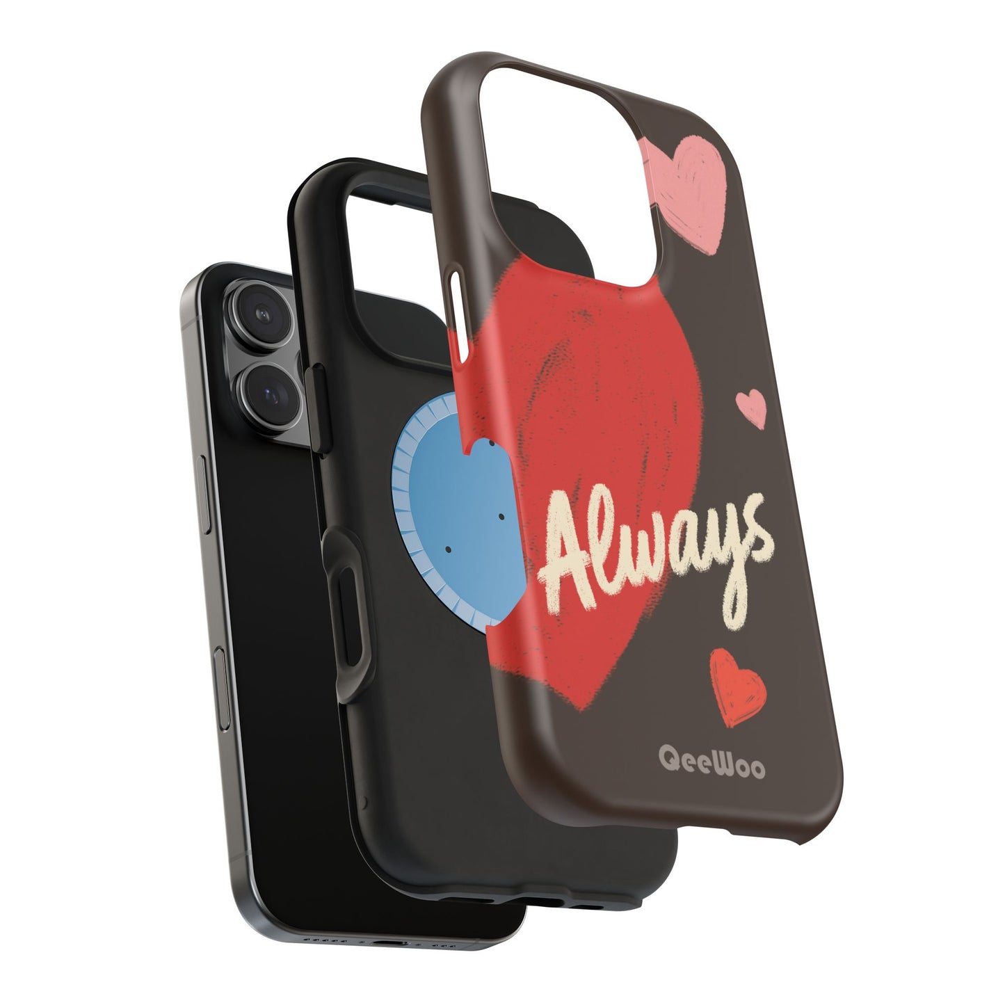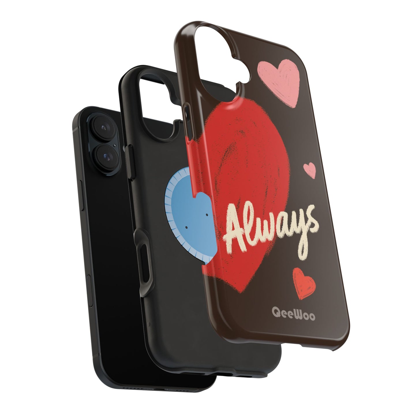 'Passionate Chocolate' a single right. A slim, impact-resistant phone case painted with warm, hand-drawn hearts and the word “Love” across a deep brown background. The glossy (or matte) full-wrap print brings bright reds and soft pinks to life, while a cushioned black TPU liner and rigid polycarbonate shell protect against everyday bumps and scratches. Built-in magnets support MagSafe® accessories for convenient charging and mounting. Lightweight yet durable, it slips easily into pockets and stands up to daily use while keeping a romantic, artsy look.